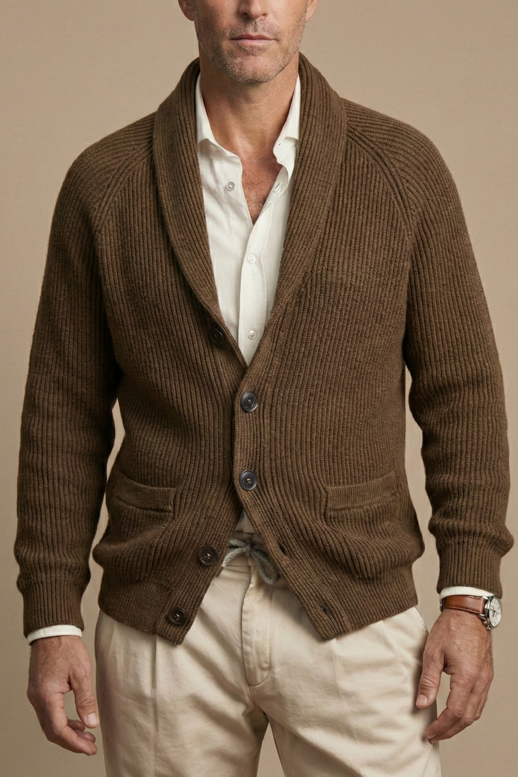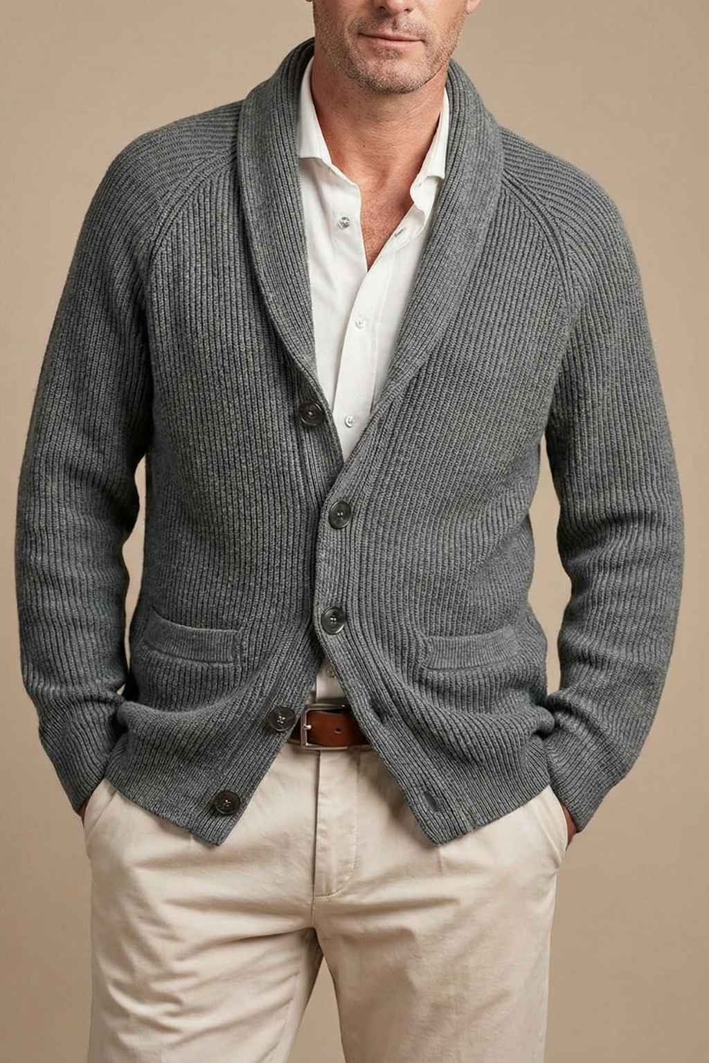 This men’s knitted cardigan features a ribbed knit construction with a shawl-style collar and a button-front closure. The design includes long sleeves with ribbed cuffs, a straight hem, and two front patch pockets. The cardigan is unlined and constructed with a structured knit pattern throughout.