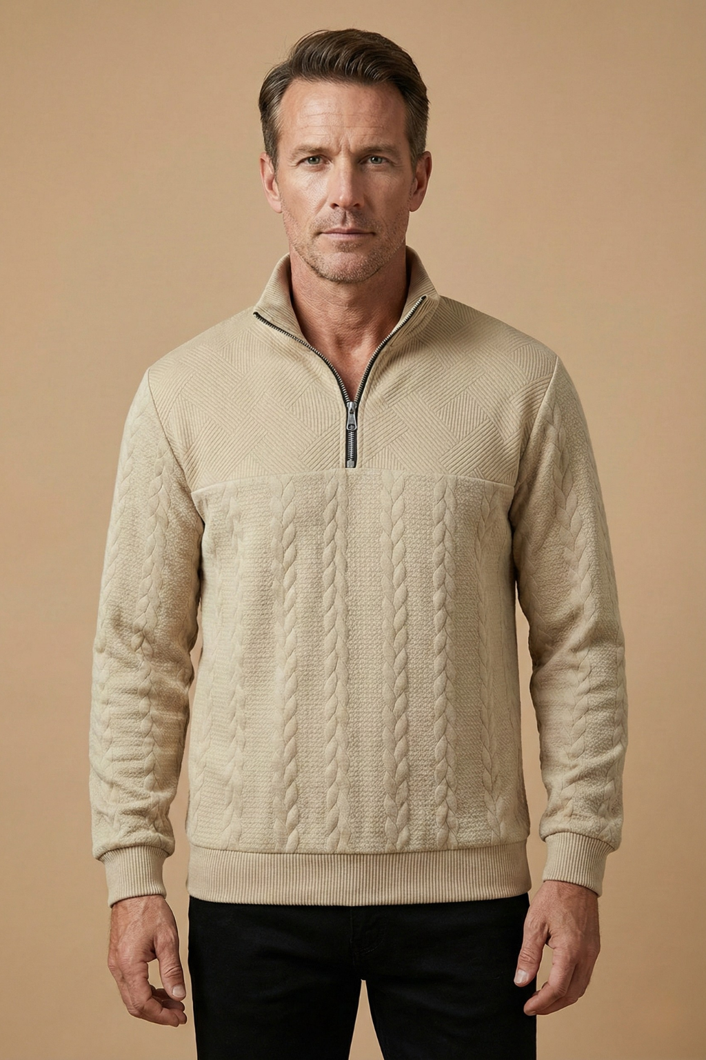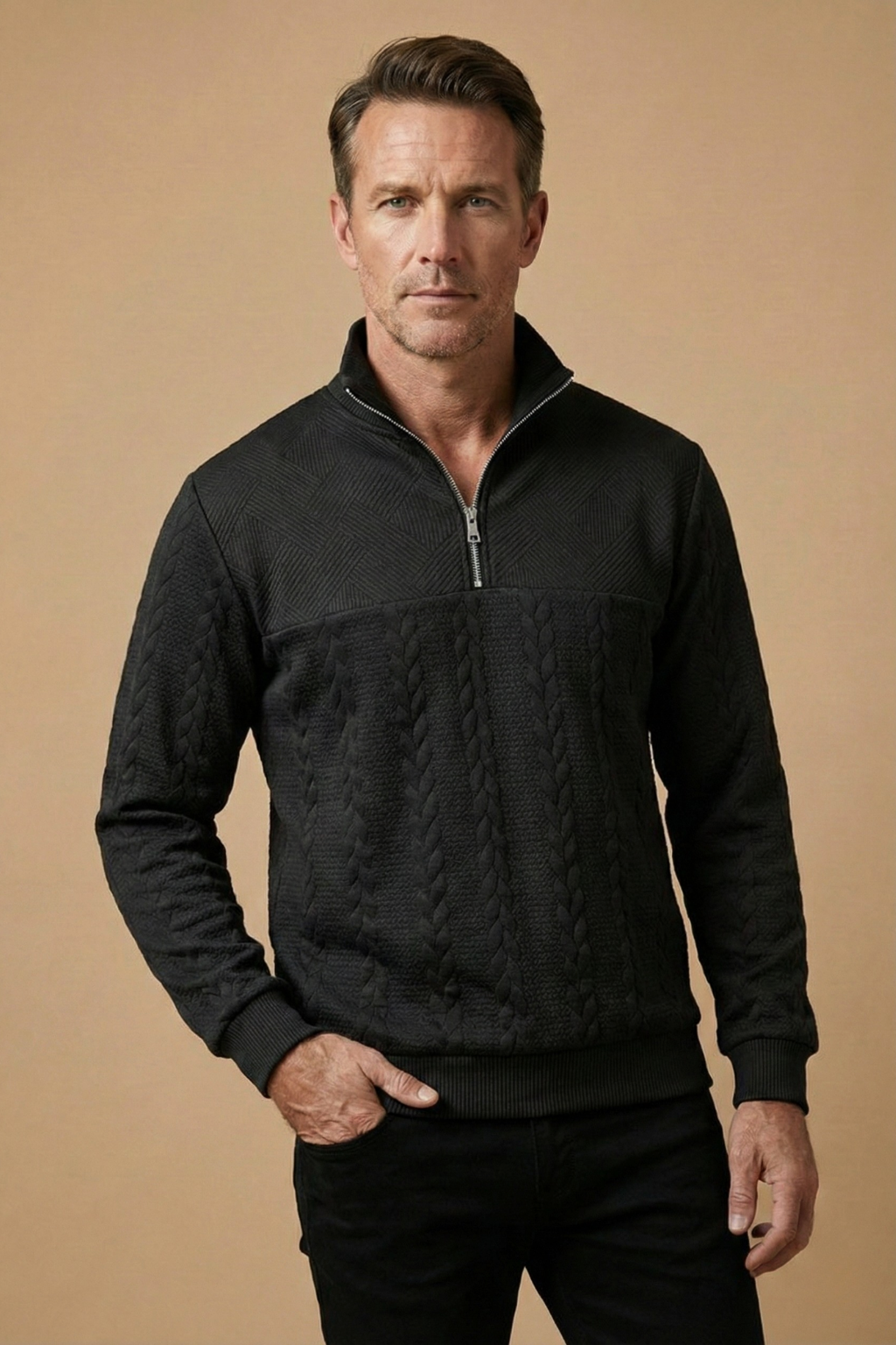 This men’s jumper features a textured cable knit design with a high zip collar for adjustable coverage. Designed with long sleeves and ribbed cuffs and hem, it offers a structured silhouette and clean finish. The quarter zip neckline adds functional detail while maintaining a classic shape.