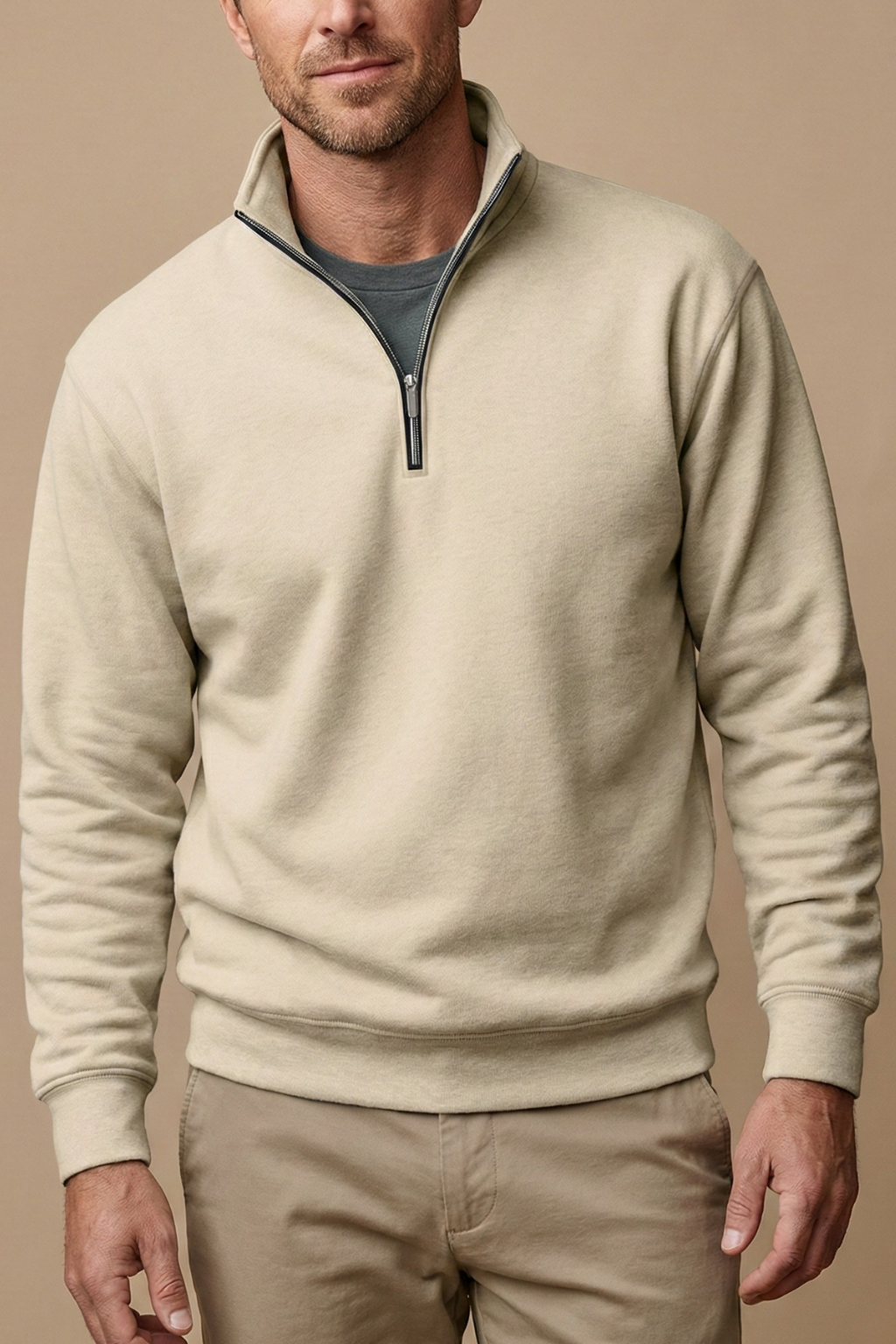 Design: Long sleeve pullover with stand collar and quarter zip closure