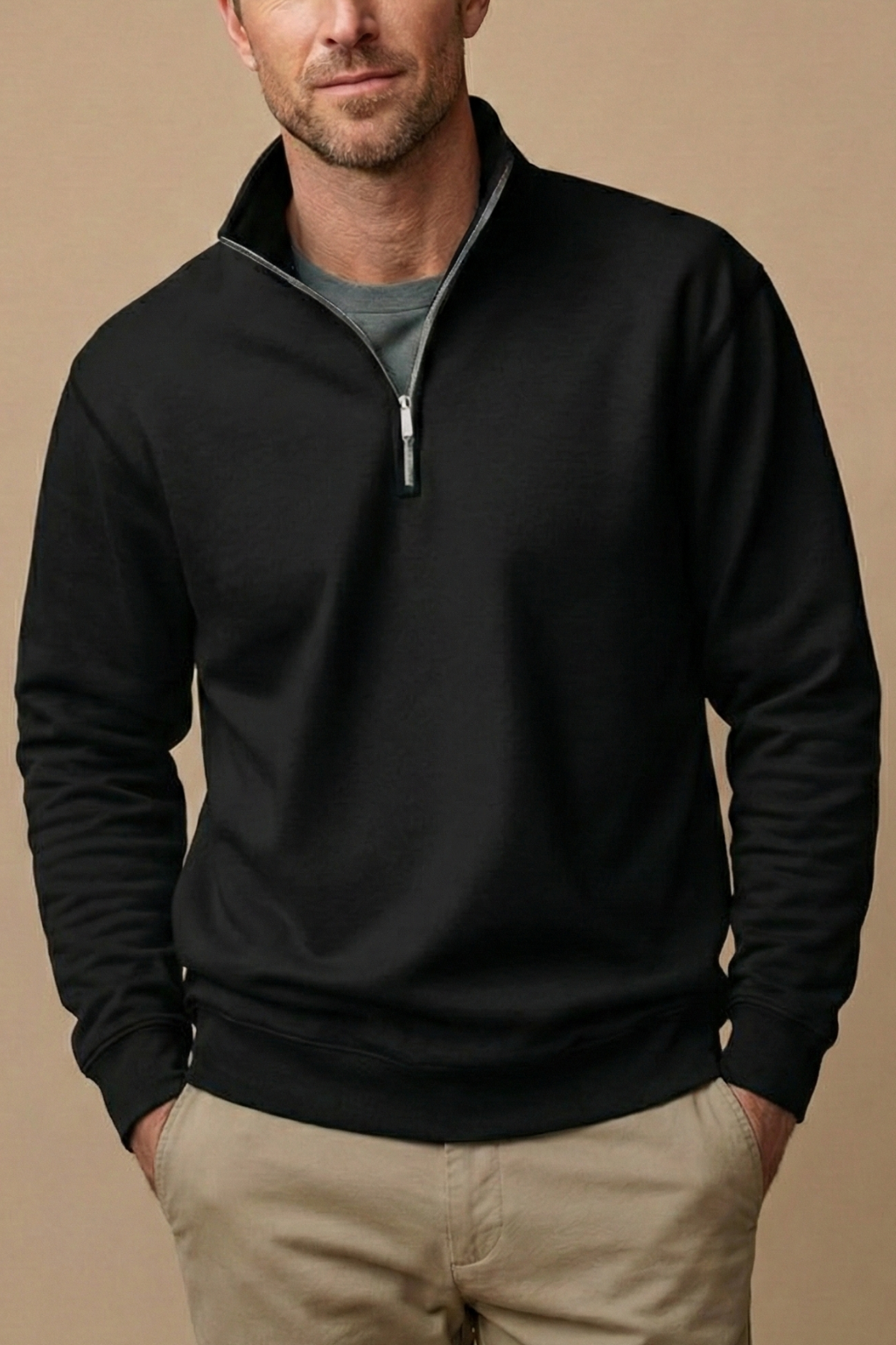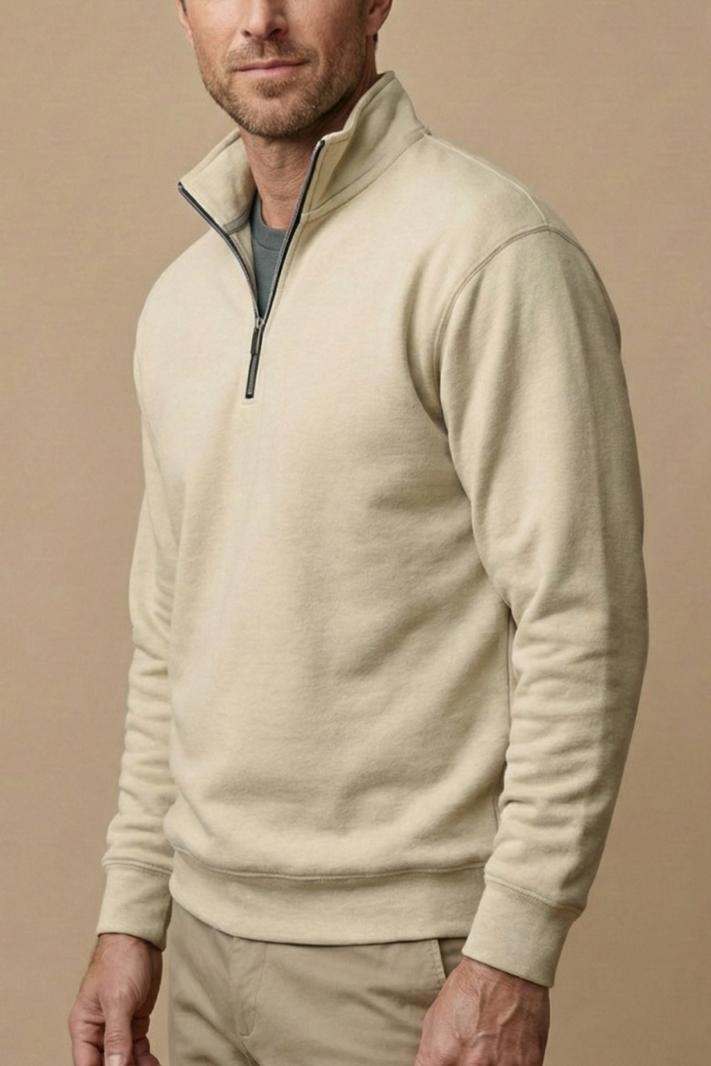 A clean, structured design featuring a stand collar with a short quarter zip closure at the front. The long sleeves and straight hem create a streamlined silhouette suited for layering, while the minimal finish keeps the look versatile. Designed as a practical mid-layer for everyday wear.