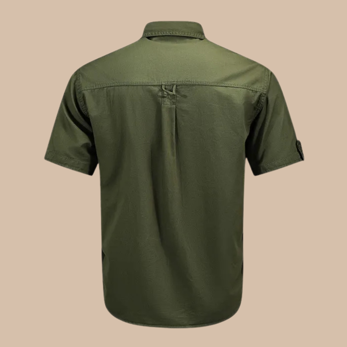 A short-sleeve cargo shirt designed with a structured collar and full button-front closure. The front features two flap chest pockets with button fastening, while the sleeves include adjustable tab detailing at the cuffs. Clean panel construction and a straight hem create a practical, defined silhouette suited to everyday wear.
