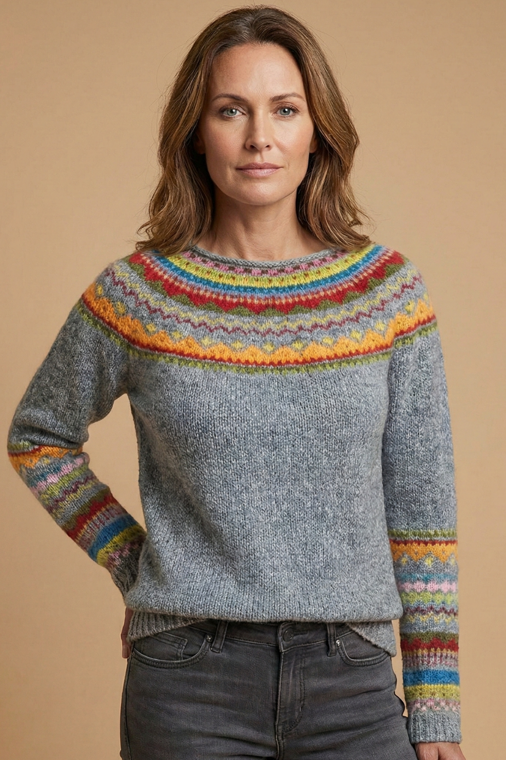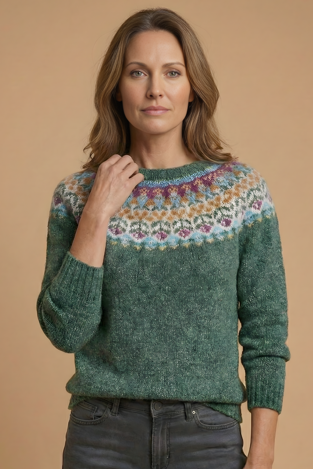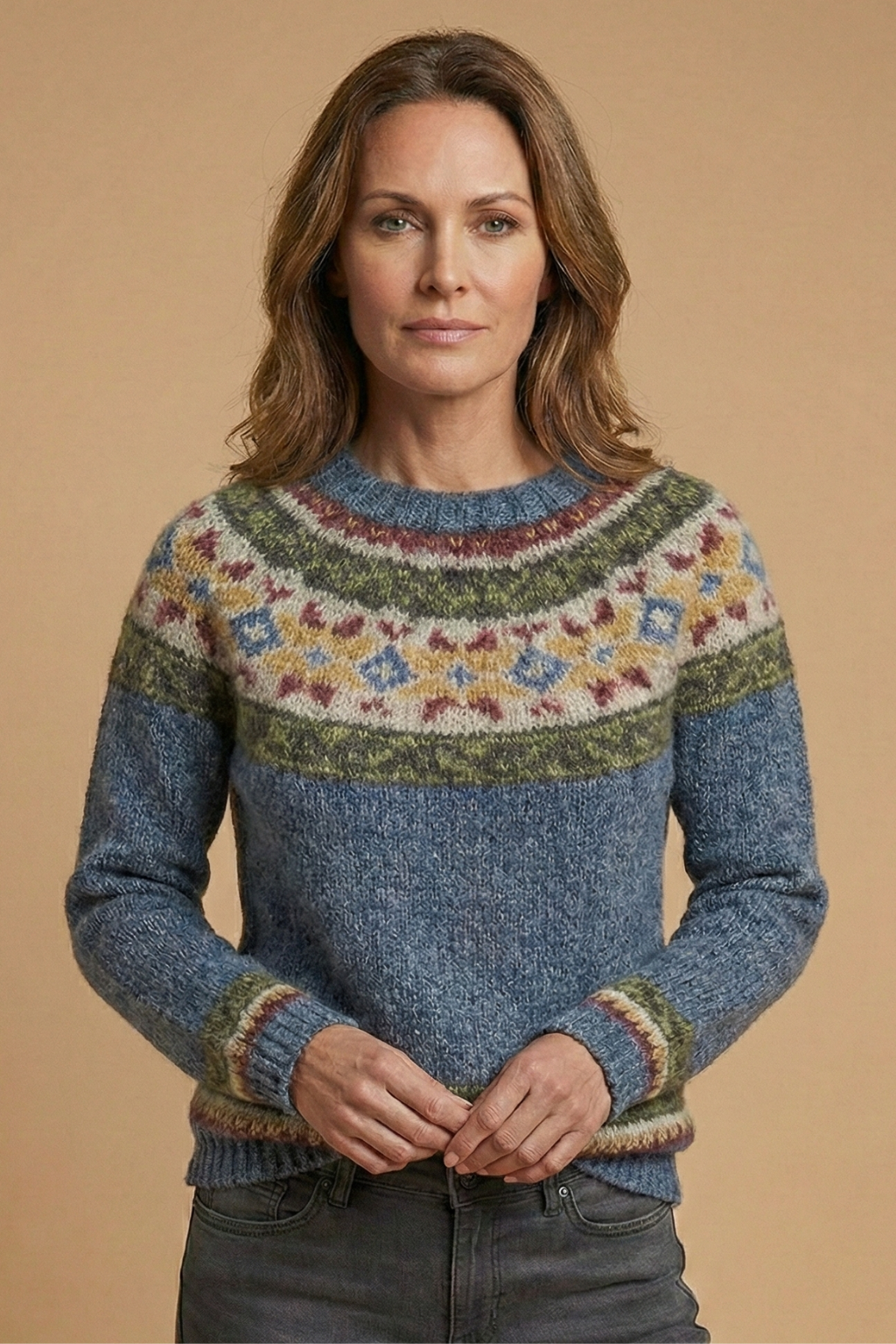 Knit jumper for women designed with a round neckline and long sleeves. The upper section features a decorative knit pattern across the chest and shoulders, transitioning into a solid knit body and sleeves. Finished with ribbed trim at the neckline, cuffs, and hem, the sweater presents a classic pullover silhouette with visible texture throughout.