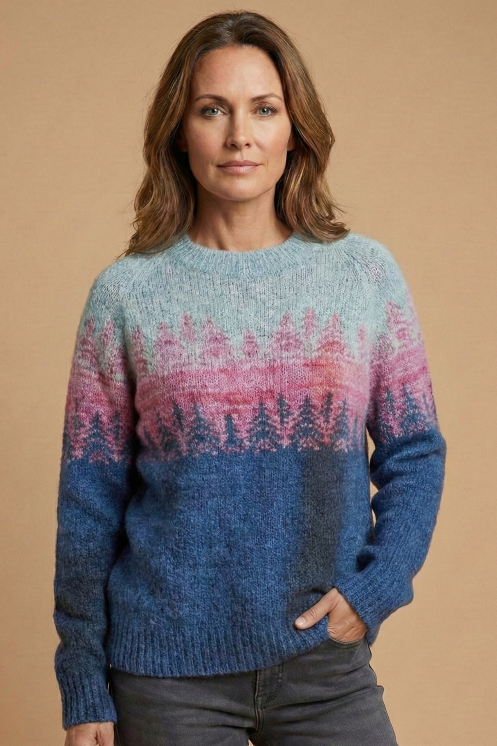 Design: Knit jumper with round neck, long sleeves, patterned upper panel, and ribbed trim
