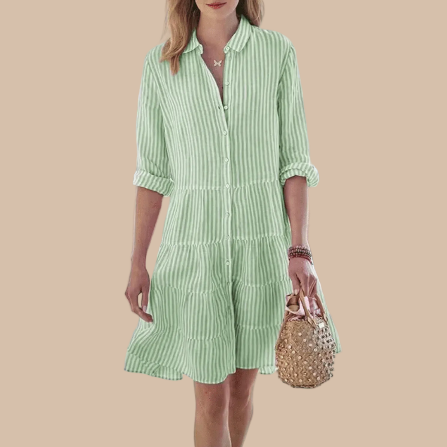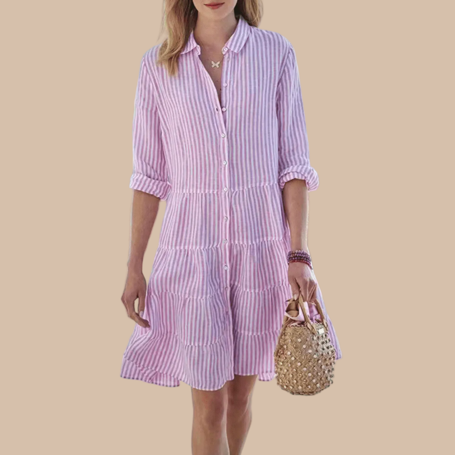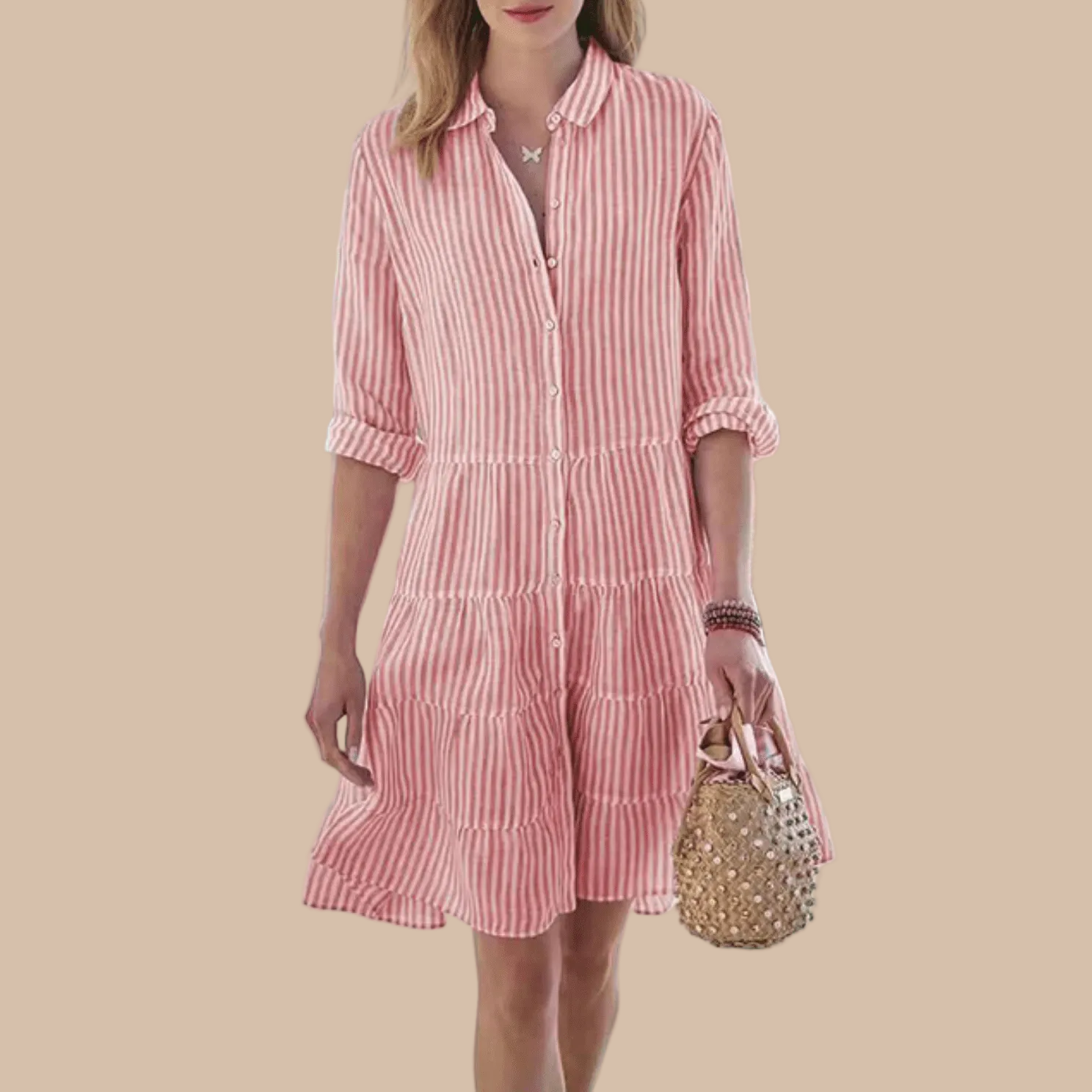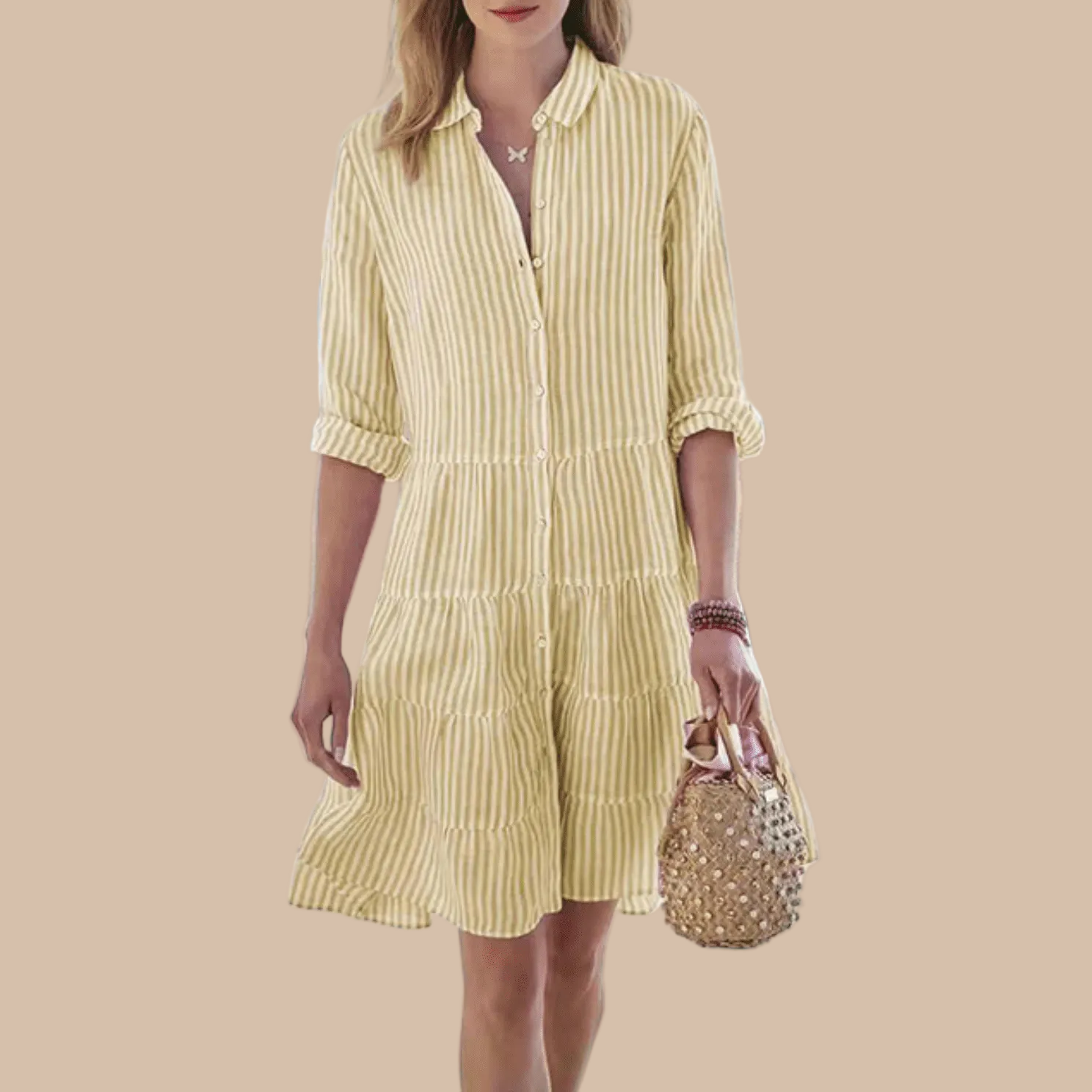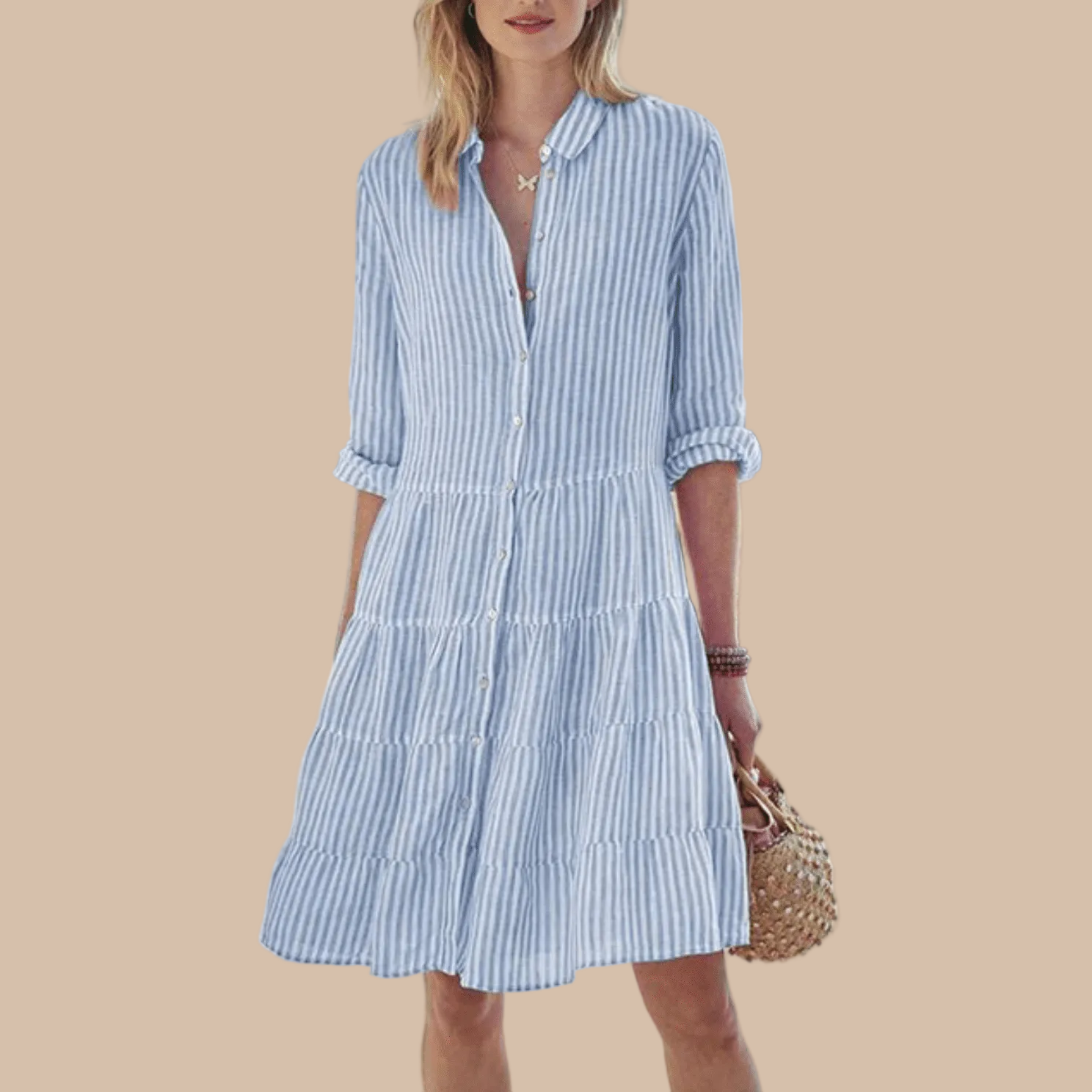 This women's striped midi dress features a relaxed button-front design with a softly tiered skirt that moves with effortless ease. The collared neckline and adjustable roll-up sleeves lend a refined yet casual feel, making it ideal for warm-weather days. Its breezy silhouette offers comfort while maintaining a polished, feminine shape.