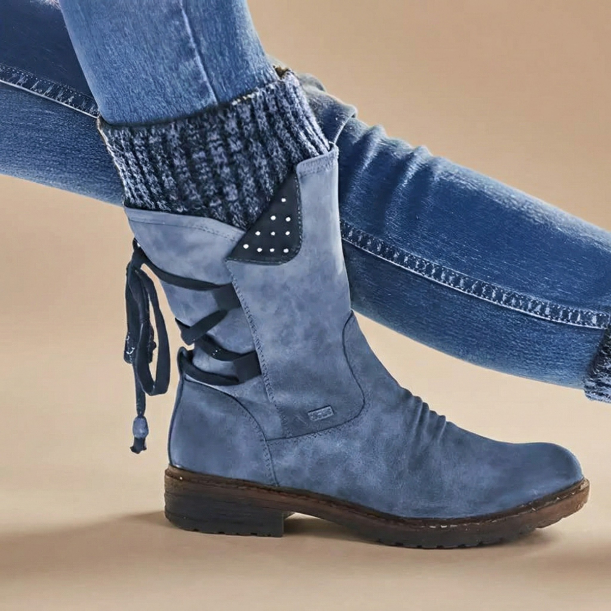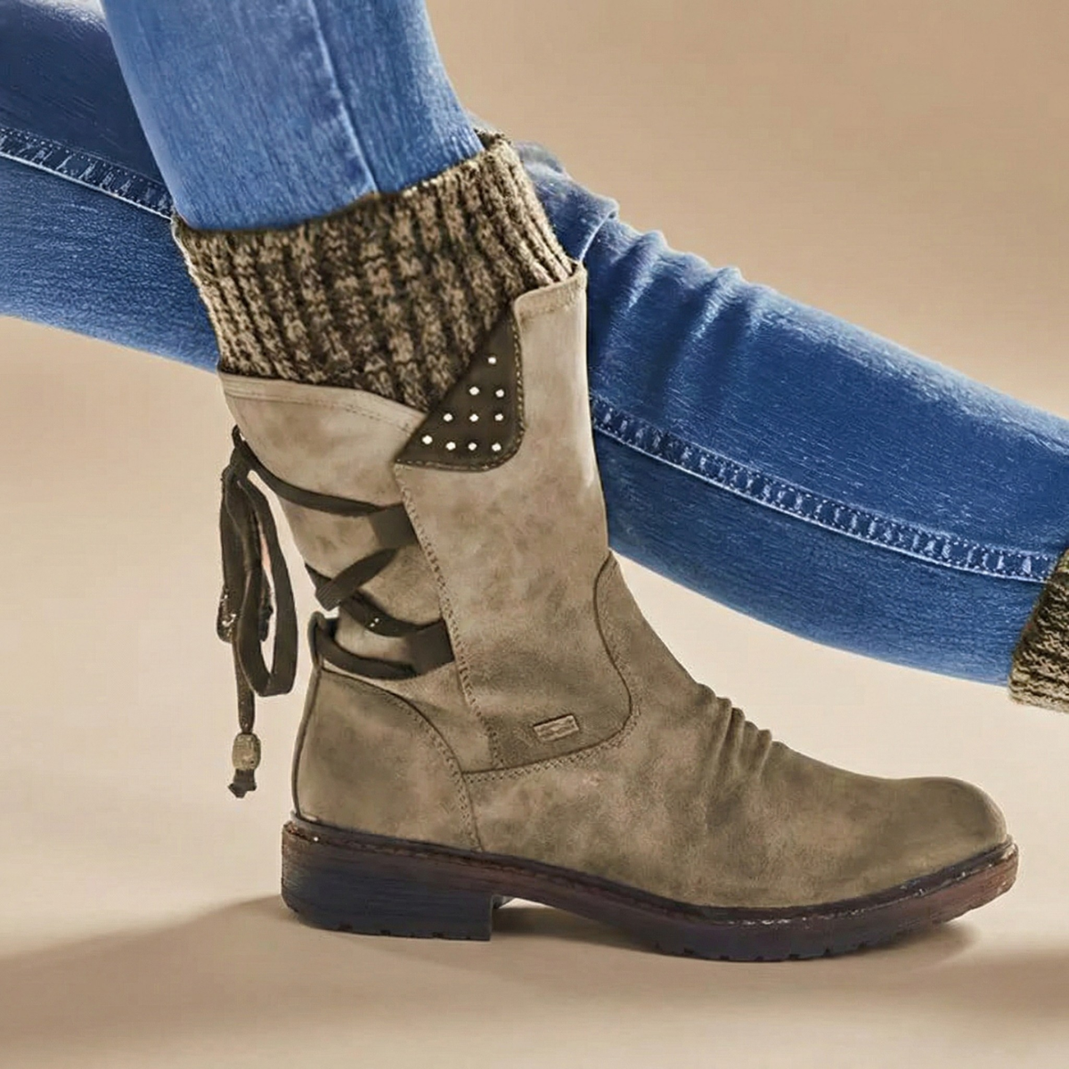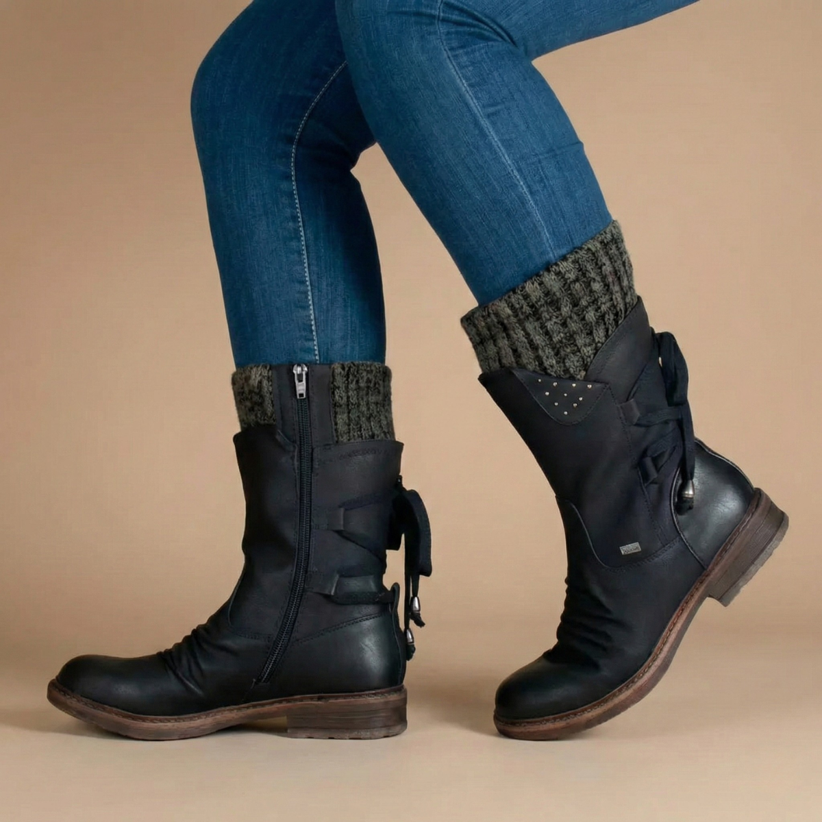 These women’s ankle boots feature a mid-height shaft with a rounded toe and low stacked heel. The design includes a side zip closure and decorative strap detailing with metal accents at the ankle. Textured panels and visible stitching define the upper, while the sole is finished with a flat tread base for stability.